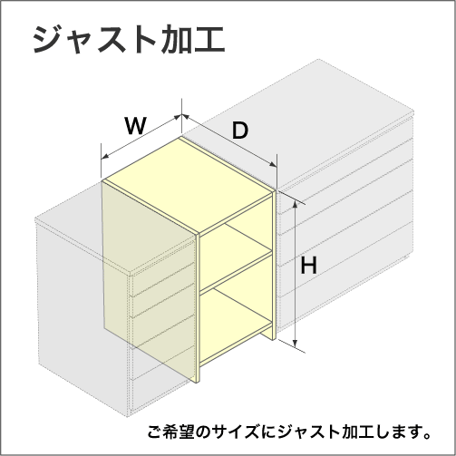 「本棚屋」標準サイズの範囲内で、製品をご希望の高さ、横幅、奥行きにジャスト加工するサービスです。例えば標準では5cm刻みの奥行を1cm刻みで指定したい場合など、標準品ではご希望のサイズにならない場合にお使い頂けるオプションサービスです。